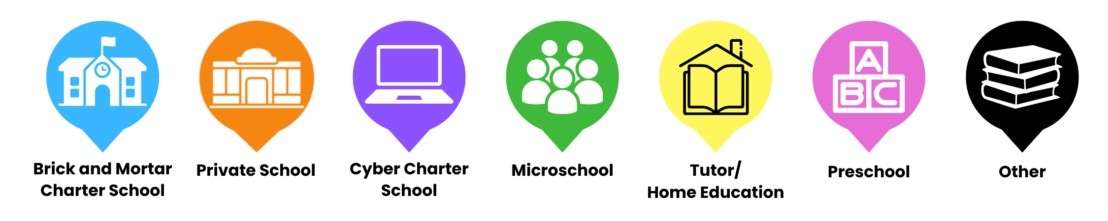Education Services Directory View out-of-state options here! School Type Brick and Mortar Charter Cyber Charter Cyber Charter School Homeschool Microschool Other Preschool Private Tutor/Home Education Region National North Central Northeast Northwest South Central Southeast Southwest Statewide County Adams Allegheny Armstrong Beaver Bedford Berks Blair Bradford Bucks Butler Cambria Cameron Carbon Centre Chester Clarion Clearfield Clinton Columbia Crawford Cumberland Dauphin Delaware Elk Erie Fayette Forest Franklin Fulton Greene Huntingdon Indiana Jefferson Juniata Lackawanna Lancaster Lawrence Lebanon Lehigh Luzerne Lycoming McKean Mercer Mifflin Monroe Montgomery Montour National Northampton Northumberland Perry Philadelphia Pike Portersville Potter Schuylkill Snyder Somerset Statewide Susquehanna Tioga Union Venango Warren Washington Wayne Westmoreland Wyoming York Reset Get Directions From To Add Waypoint For Driving Walking Transit Bicycling show options hide options Avoid Tolls Avoid Highways Avoid Ferries Print directions Reset directions Fetching directions...... Reset directions Print directions Thank you to WP Go Maps for providing us with this mapping tool Sign up to be a part of our educator map!